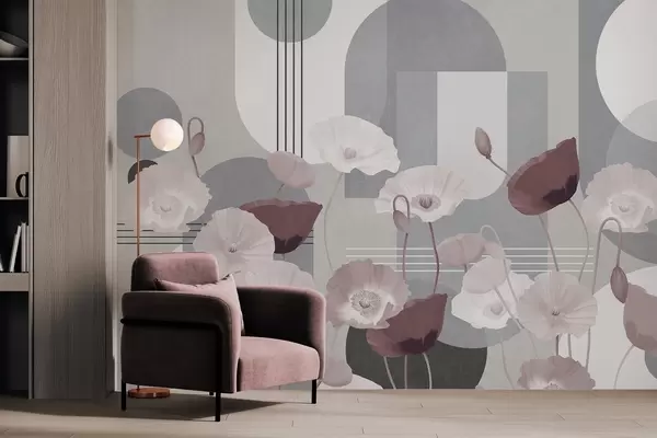 Фототапет Макове в бели и сиви цветове с геометрични фигури на заден план, кръгове и арки, минималистичен стил, меки цветове Nr w09289v1
