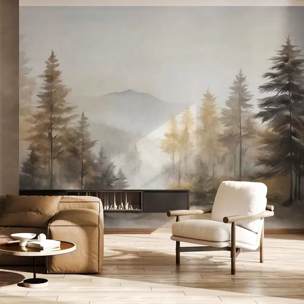 Фототапет Текстурирана есенна гора с високи борови дървета и планини на заден план, цветовете са приглушени и земни стил на рисуване Nr w09290
