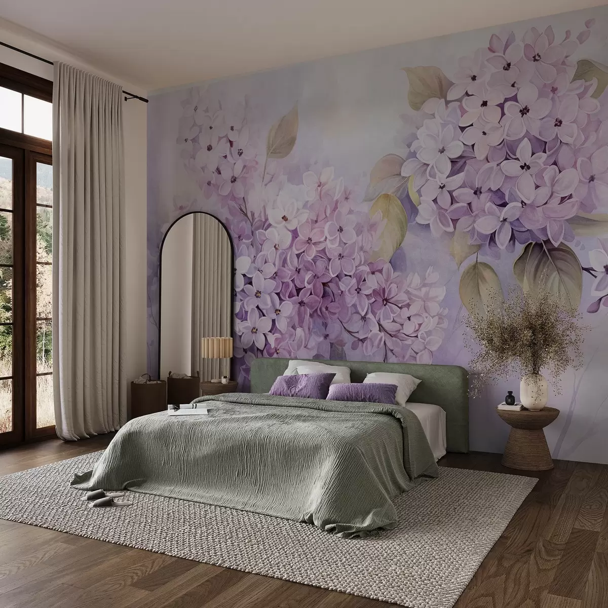 Фототапет Лилави текстурирани цветя със светлолилави венчелистчета, светлозелени листа, акварелен стил, меки, пастелни цветове, деликатни движения на четката Nr w09291