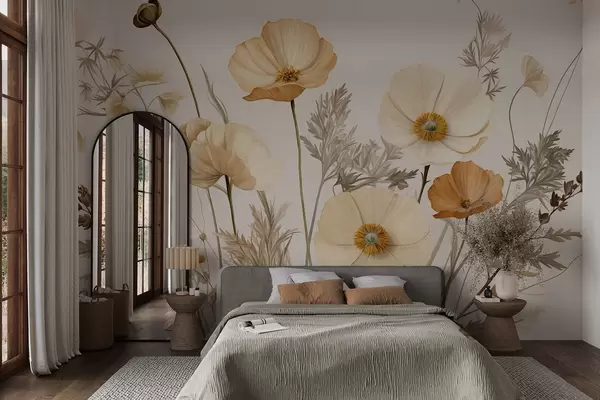 Фототапет Оранжеви и бели винтидж макове с тънки стъбла и листа, светлобежов фон, акварелен стил Nr w09293