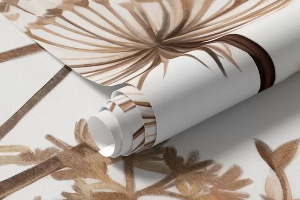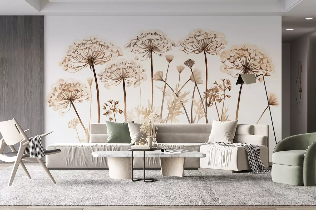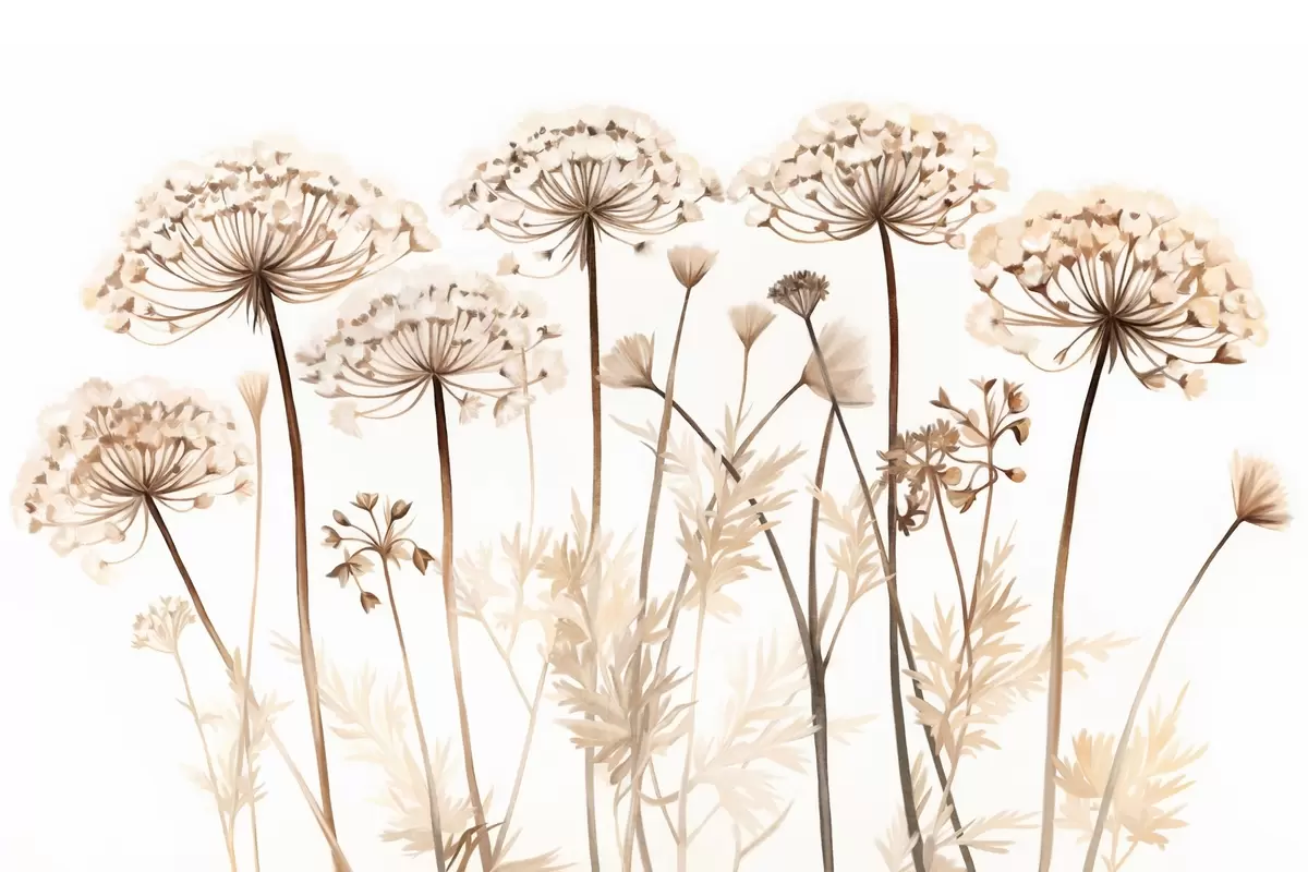 Фототапет Цветя от дантела на кралица Анна в полето, текстурирана имитация на картина, кафява, бежова и бяла цветова палитра, ботаническа илюстрация Nr w09294