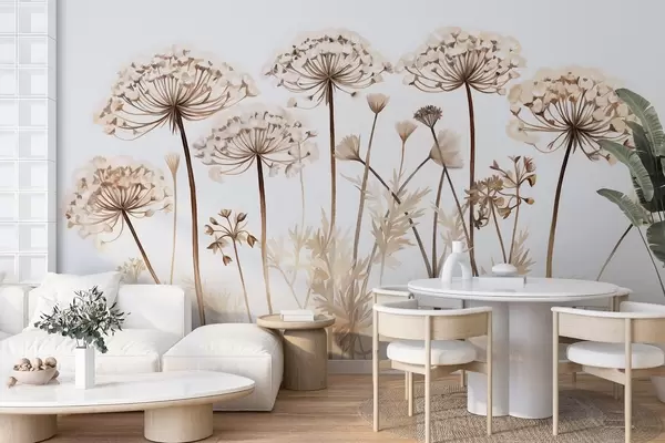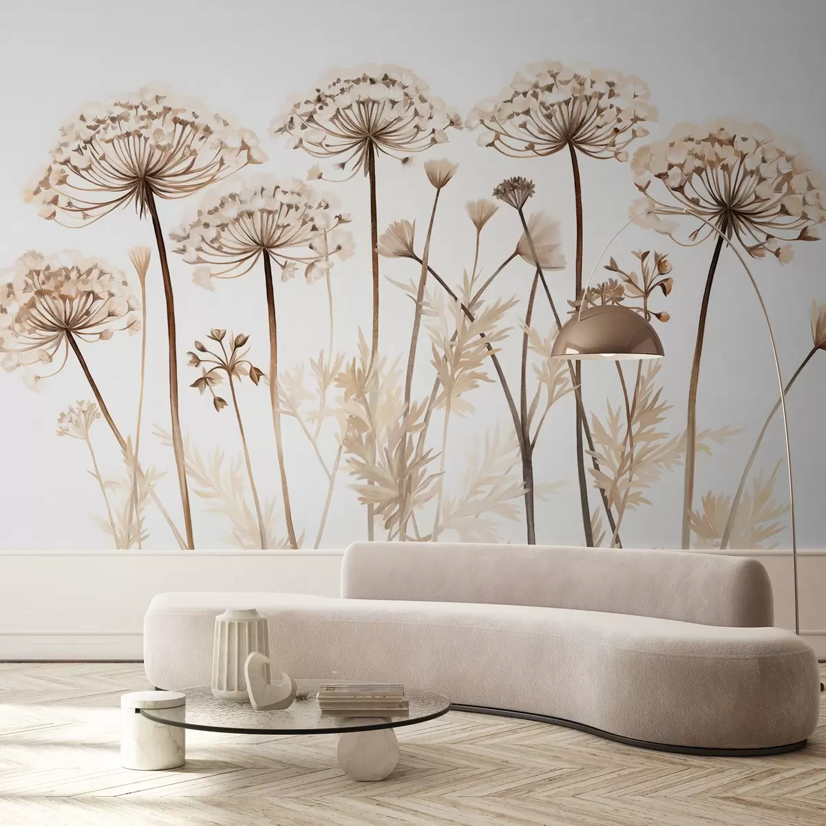 Фототапет Цветя от дантела на кралица Анна в полето, текстурирана имитация на картина, кафява, бежова и бяла цветова палитра, ботаническа илюстрация Nr w09294
