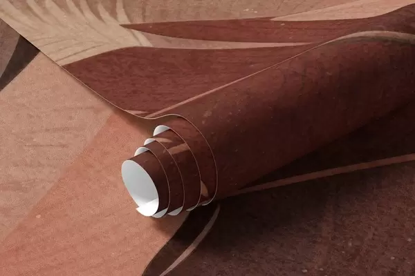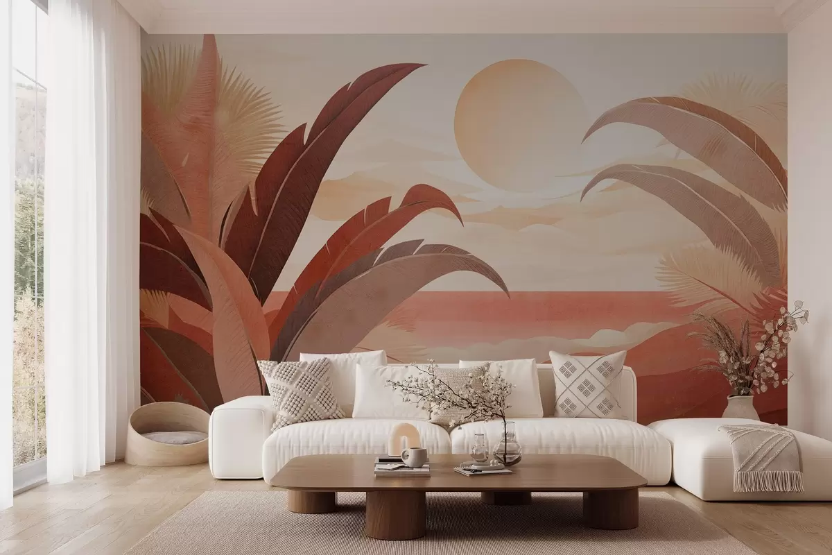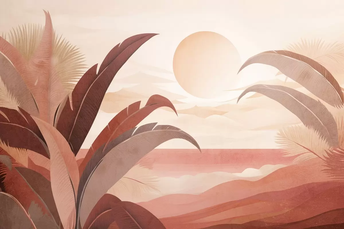 Фототапет Тропически текстуриран абстрактен пейзаж с палмови листа и голямо слънце в небето, топла цветова палитра, минималистичен стил, стилизиран Nr w09296