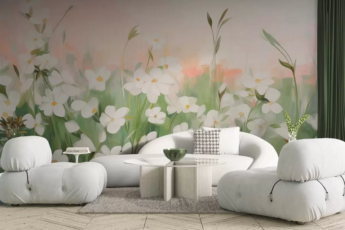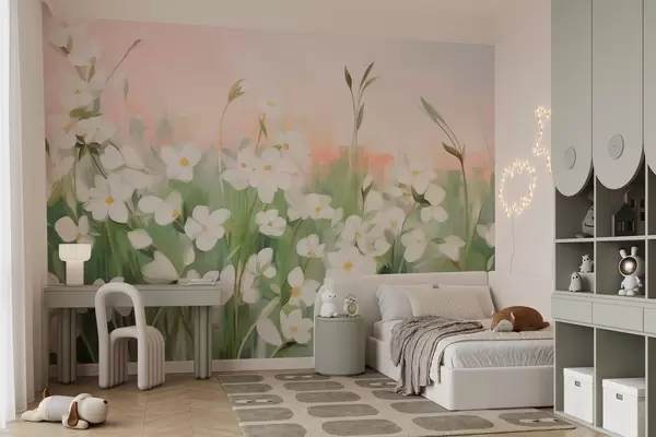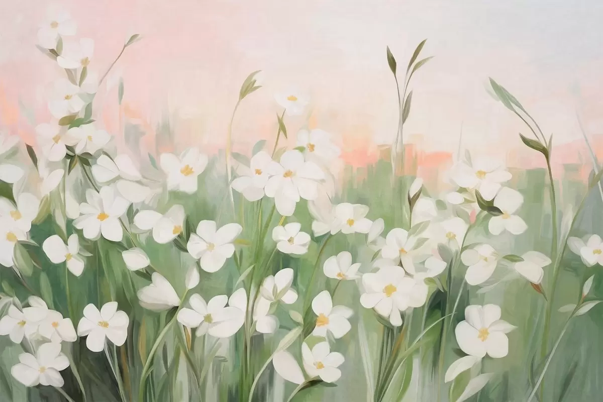 Фототапет Абстрактно поле от диви цветя със зелени стъбла и листа, на фона на меко розово и бяло небе с текстура Nr w09297