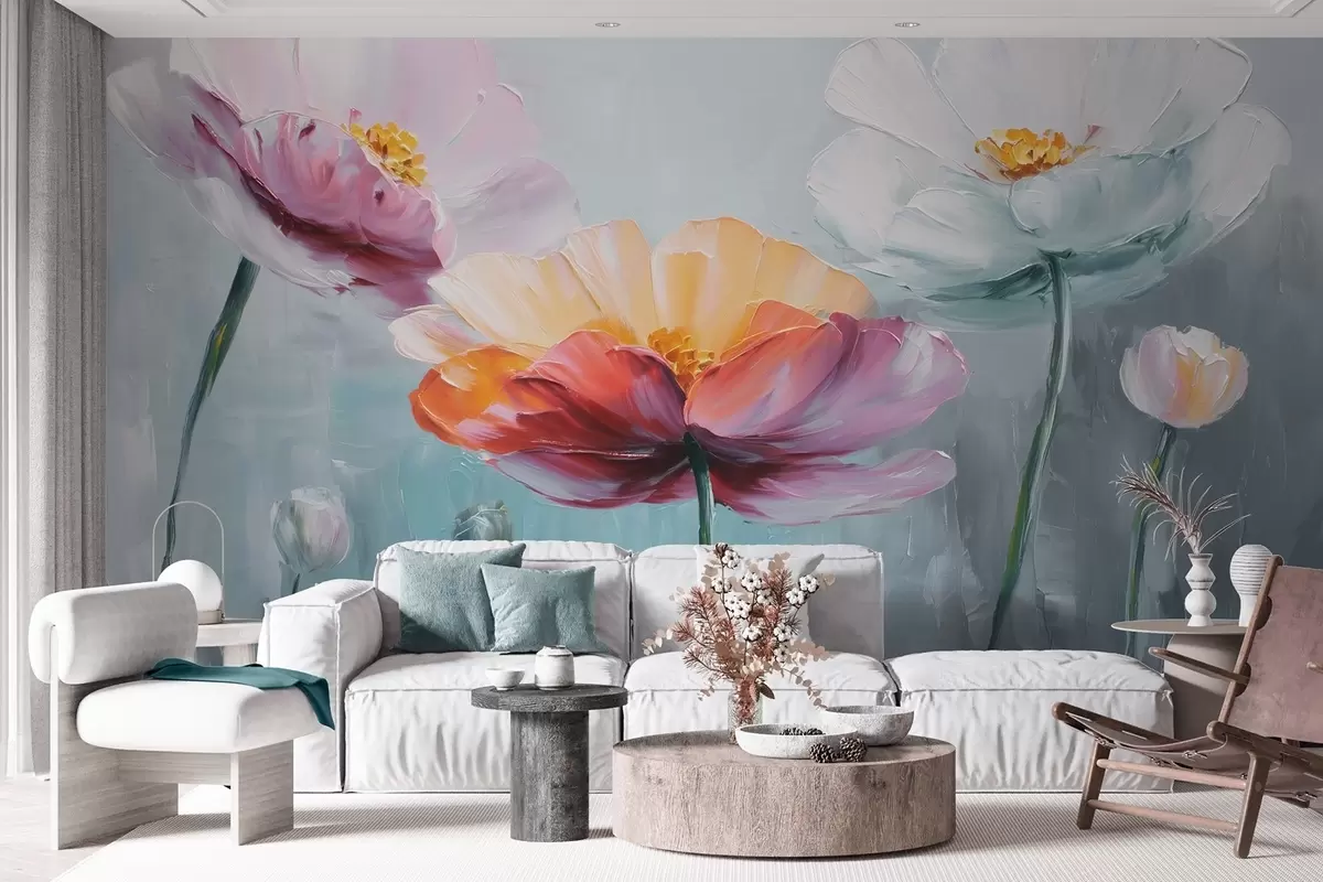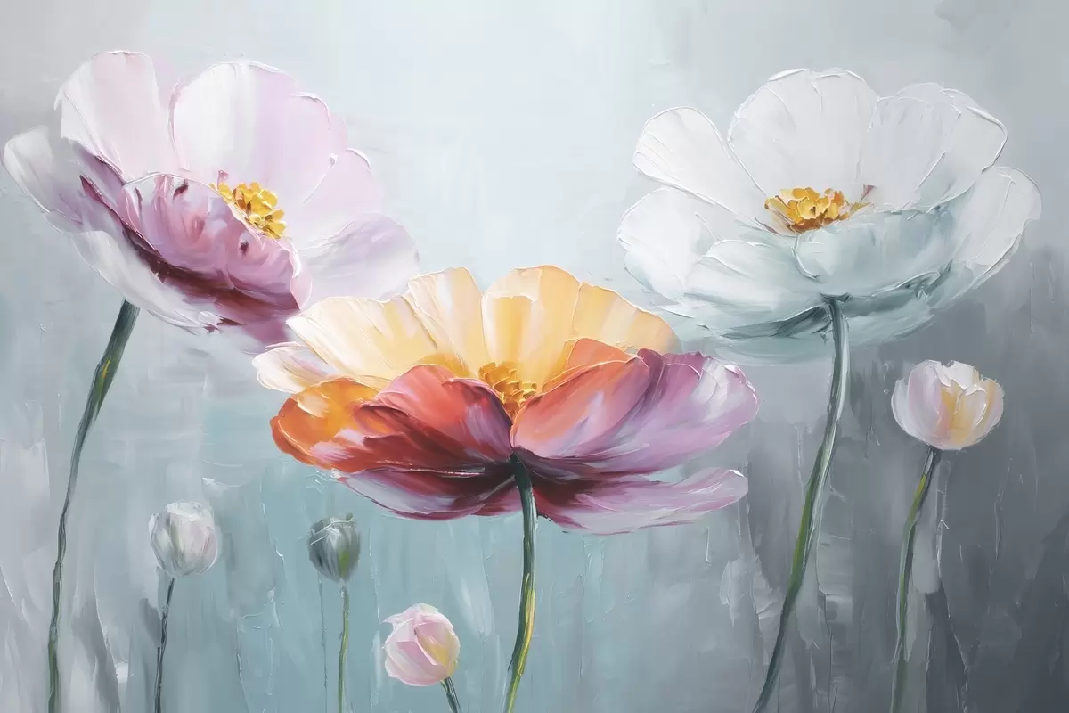 Фототапет Ярки цветя в техниката на маслената живопис на син фон Nr w09310