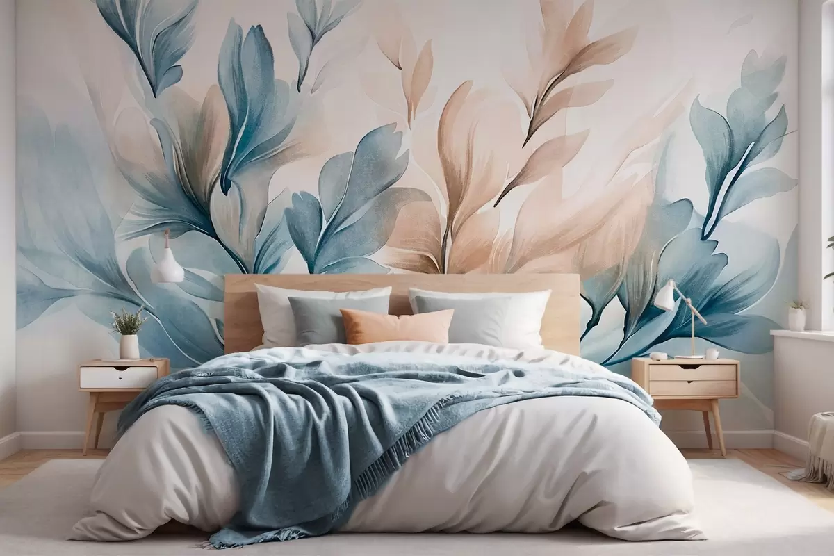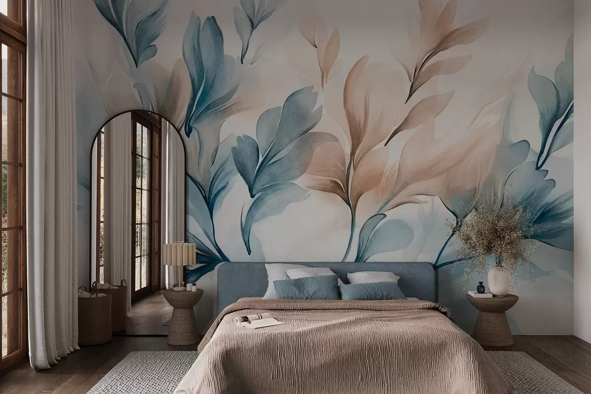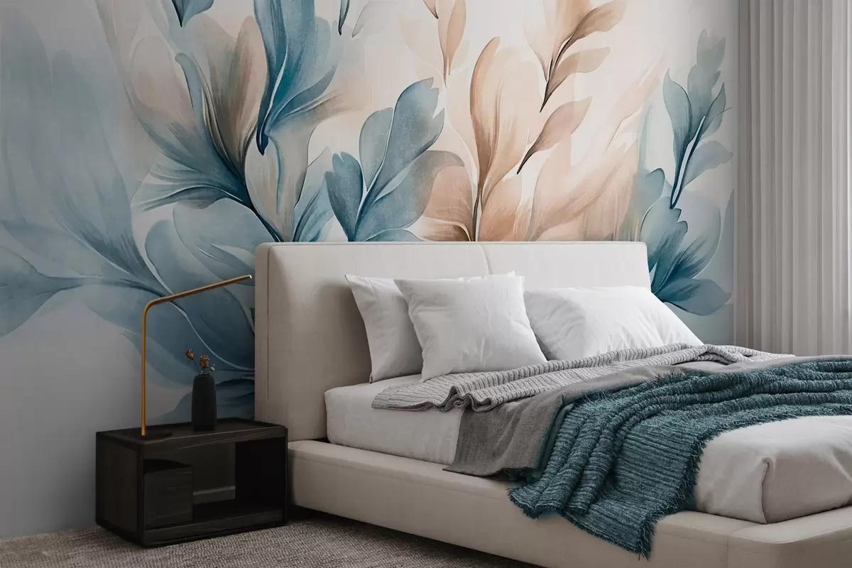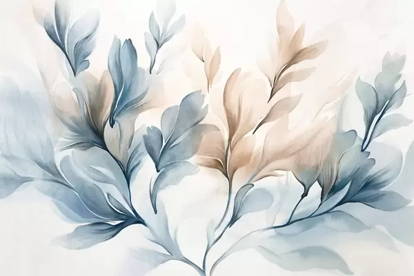 Фототапет Сини и кафяви абстрактни листа с видими щрихи на четката , леки и текстурирани, мека цветова палитра, акварелен ефект Nr w09313