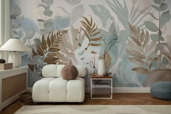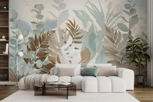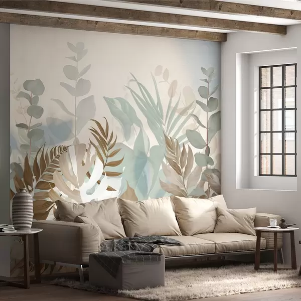 Фототапет Пастелни растения папрати, монстера и евкалипт, лек текстуриран фон, меко осветление, спокойно , ботаническа илюстрация Nr w09316v1