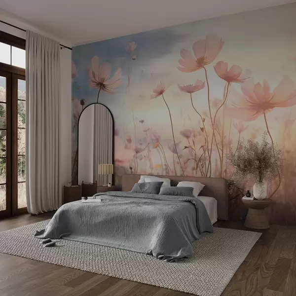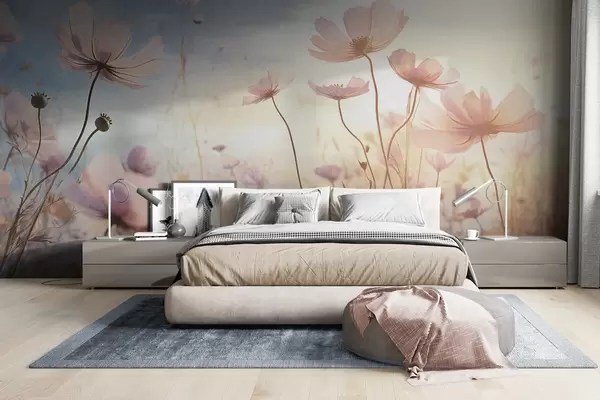Фототапет Поле от розови текстурирани цветя с дълги стъбла на фона на меко синьо и жълто небе, което създава мечтателна атмосфера Nr w09320