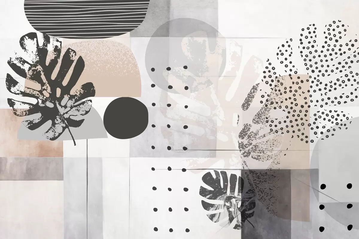 Фототапет Абстрактен принт с геометрични фигури и тропически листа от монстера, кръгове, точки и линии, модерен и минималистичен дизайн Nr w09333