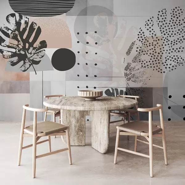 Фототапет Абстрактен принт с геометрични фигури и тропически листа от монстера, кръгове, точки и линии, модерен и минималистичен дизайн Nr w09333
