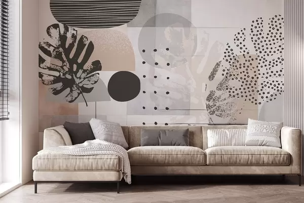 Фототапет Абстрактен принт с геометрични фигури и тропически листа от монстера, кръгове, точки и линии, модерен и минималистичен дизайн Nr w09333