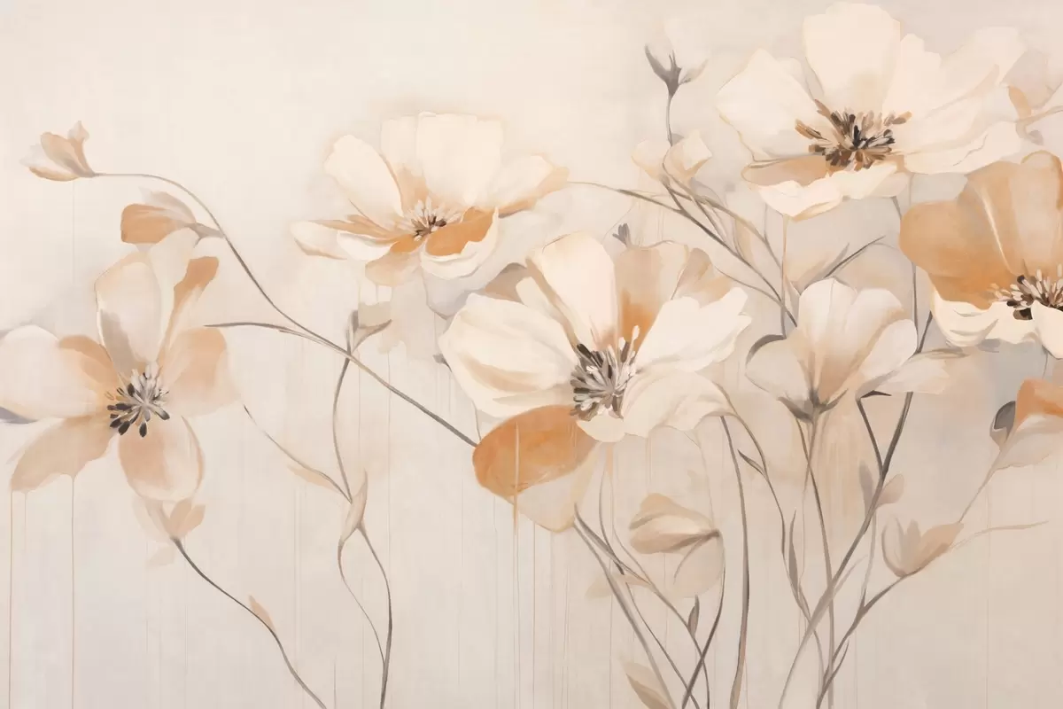 Фототапет Бели и оранжеви текстурирани цветя с дълги стъбла, светъл фон, меки цветове, елегантна композиция, деликатни движения на четката Nr w09335