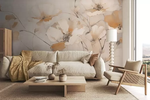 Фототапет Бели и оранжеви текстурирани цветя с дълги стъбла, светъл фон, меки цветове, елегантна композиция, деликатни движения на четката Nr w09335