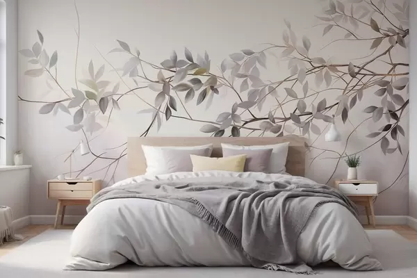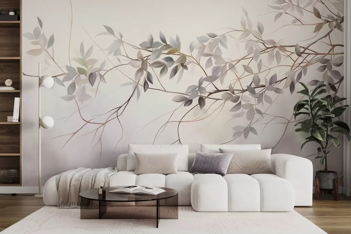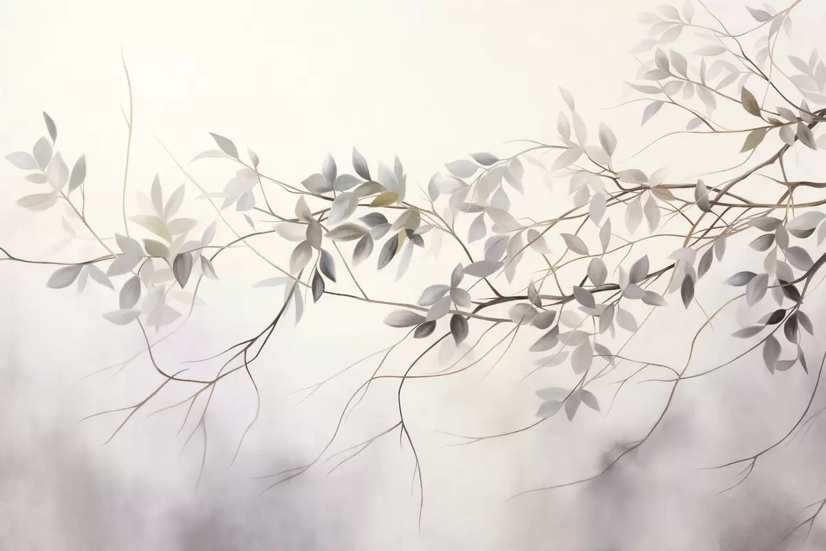Фототапет Деликатни клони с текстура, с приглушени сиви, лилави и зелени листа на мек, размазан фон Nr w09336