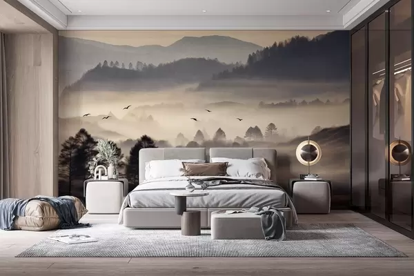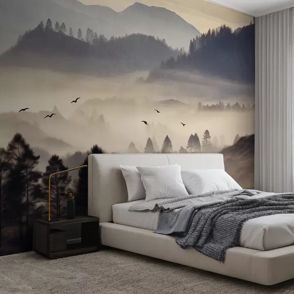 Фототапет Текстуриран планински пейзаж с пластове мъгла, силуети на дървета на преден план, далечна планинска верига, меко осветление Nr w09338
