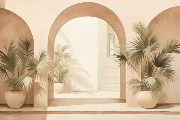 Фототапет Текстурирани арки със саксийни растения, светлобежова цветова гама, минималистичен дизайн, стълбище на заден план Nr w09339
