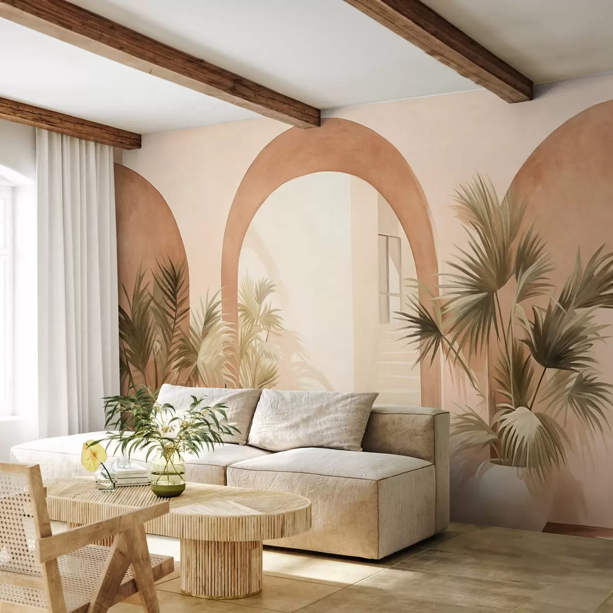 Фототапет Текстурирани арки със саксийни растения, светлобежова цветова гама, минималистичен дизайн, стълбище на заден план Nr w09339