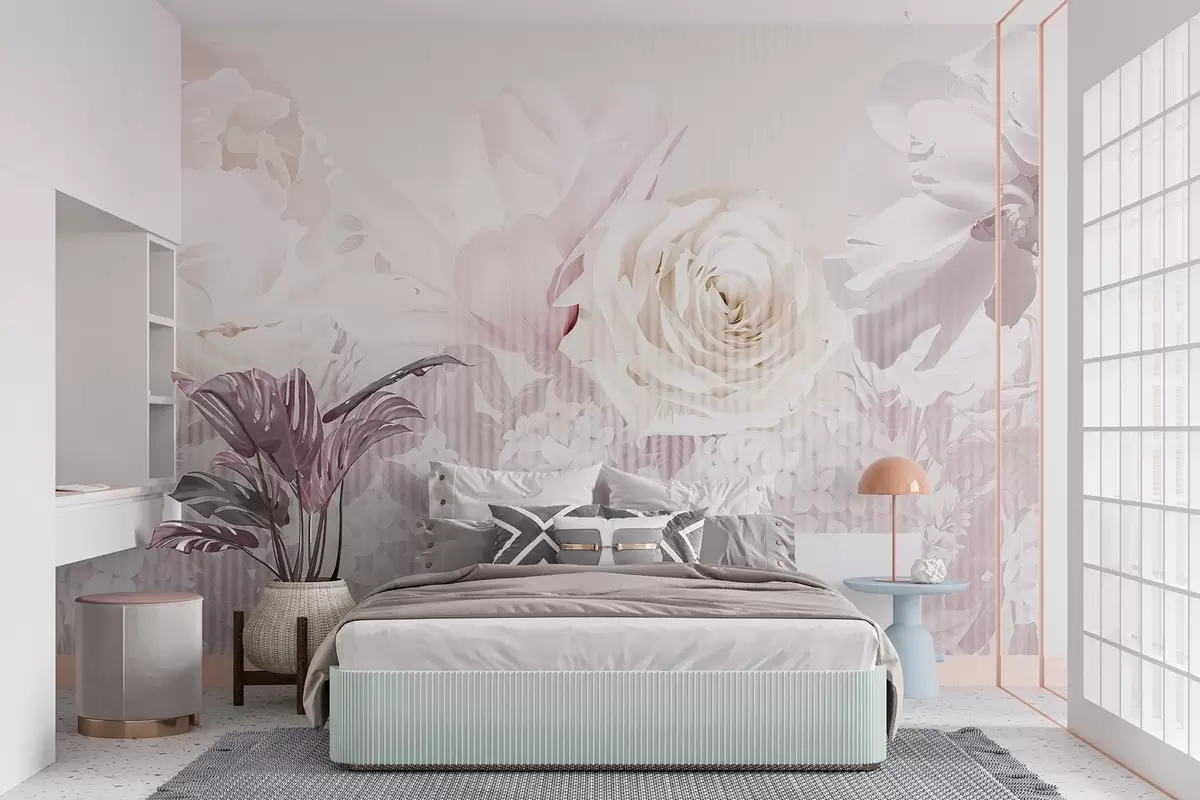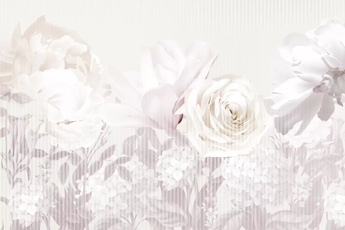 Фототапет Цветна аранжировка с рози, хортензии и лалета в меки пастелни нюанси на бяло, розово и бежово, с текстура на ивици Nr w09340