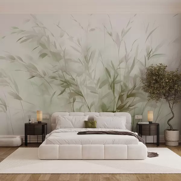 Фототапет Трева и плевели с тънки листа и стъбла, светлозелени и кафяви цветове, меки и деликатни движения на четката, минималистичен печат Nr w09342