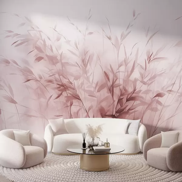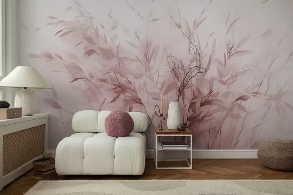 Фототапет Трева и плевели с тънки листа и стъбла, светлорозови цветове, меки и деликатни движения на четката, минималистичен печат Nr w09342v2