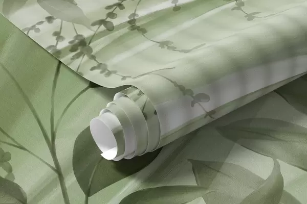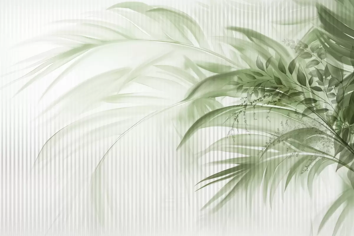 Фототапет Палмови тропически зелени листа на бял раиран фон, меко осветление, деликатни движения на четката, органични форми Nr w09343