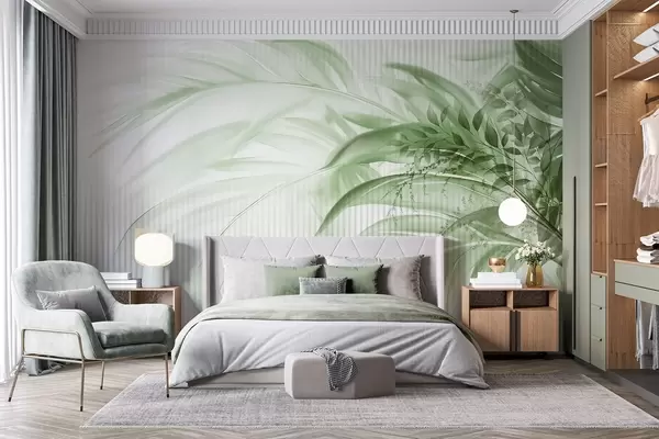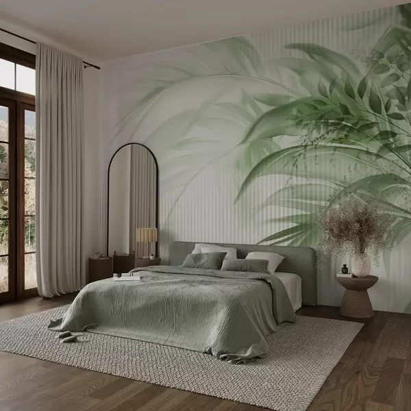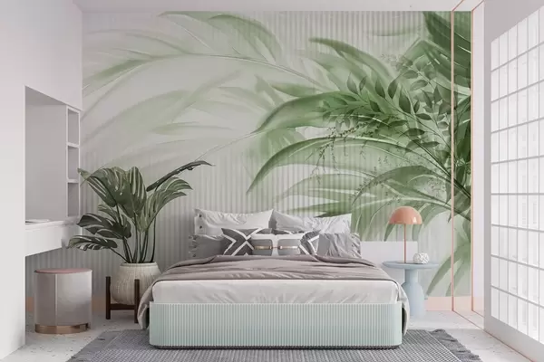 Фототапет Палмови тропически зелени листа на бял раиран фон, меко осветление, деликатни движения на четката, органични форми Nr w09343