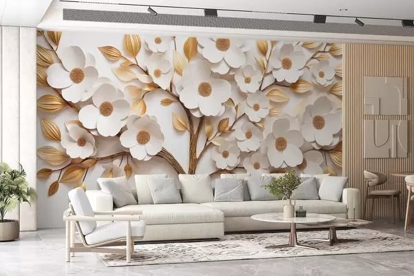 Фототапет Дърво с бели цветове и имитация на релефни листа Nr w09348