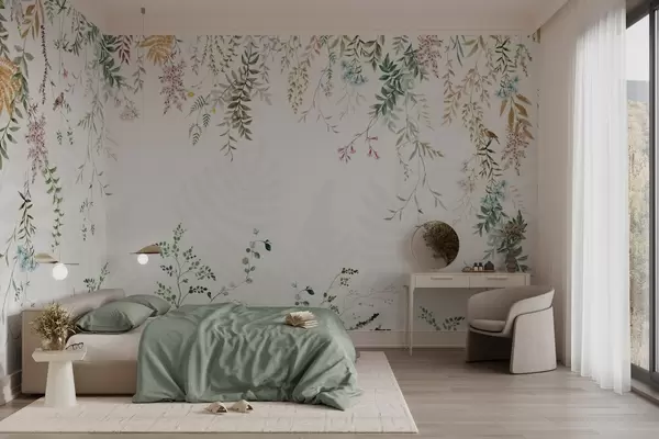 Фототапет Ботаническа илюстрация с папрати, трева и висящи растения, пастелни тонове, на бял фон, акварелен текстуриран стил Nr w09364
