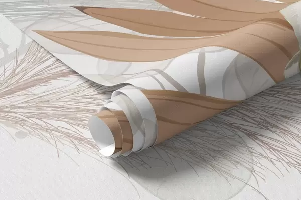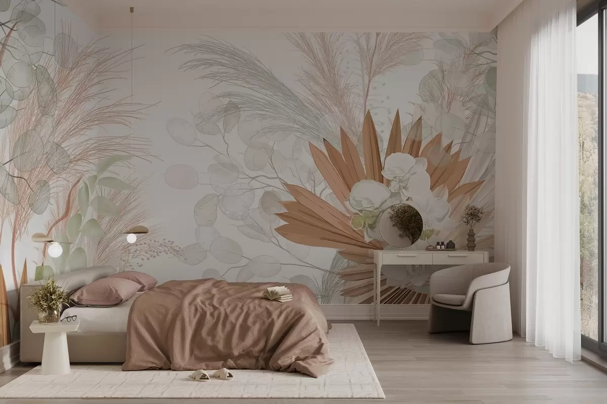 Фототапет Пампасова трева, евкалипт, тропически листа и орхидеи на бял фон, пастелни цветове Nr w09366