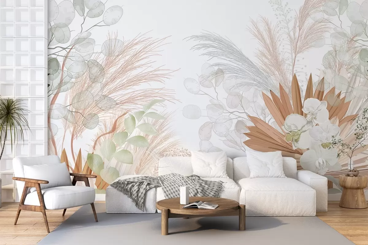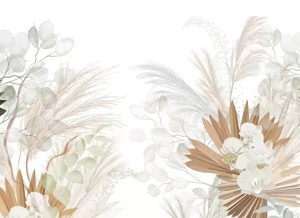 Фототапет Пампасова трева, евкалипт, тропически листа и орхидеи на бял фон, пастелни цветове Nr w09366