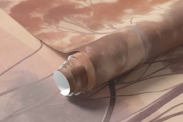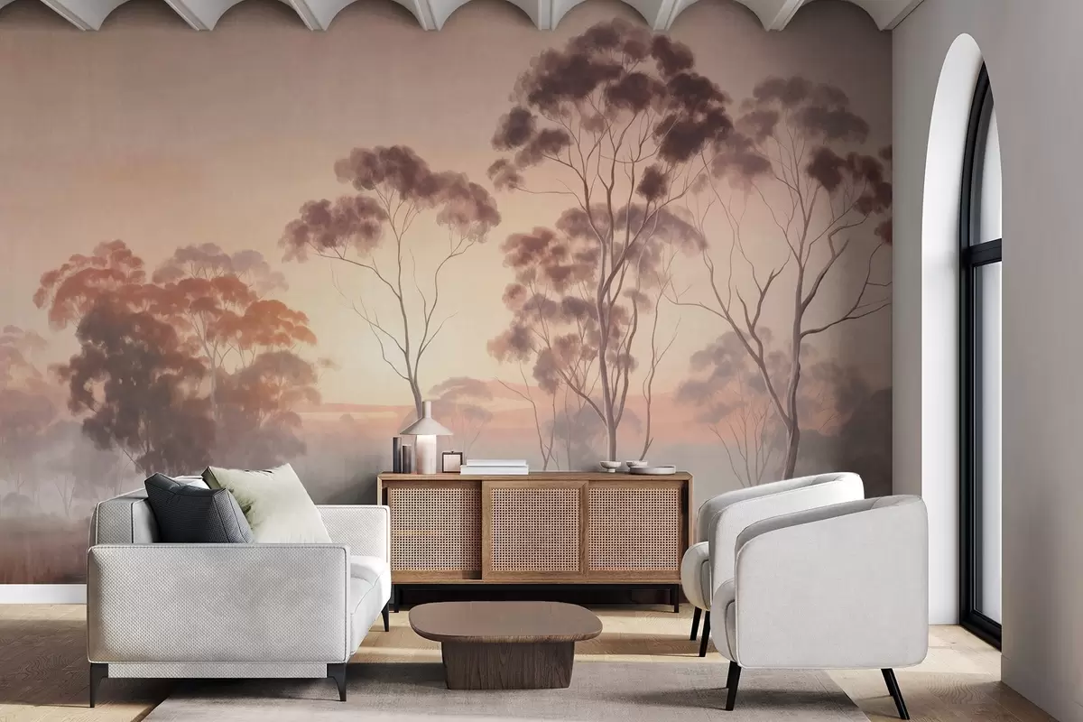 Фототапет Пейзаж с евкалиптови дървета в поле с пастелно розово и оранжево небе, лека мъгла, текстурирана живопис Nr w09367