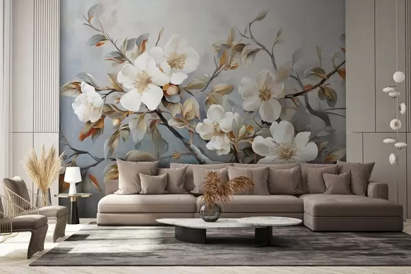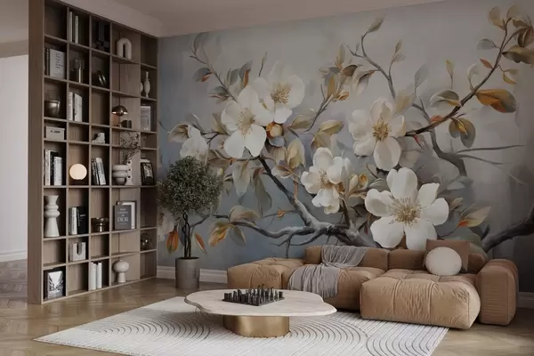 Фототапет Бели цветя с жълти плодници върху клон на дърво с листа, светъл фон, стил винтидж живопис, текстуриран печат Nr w09368