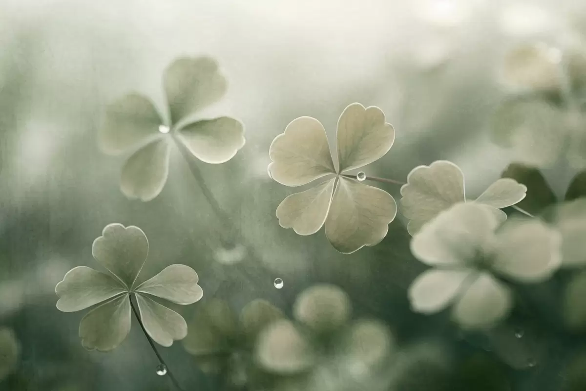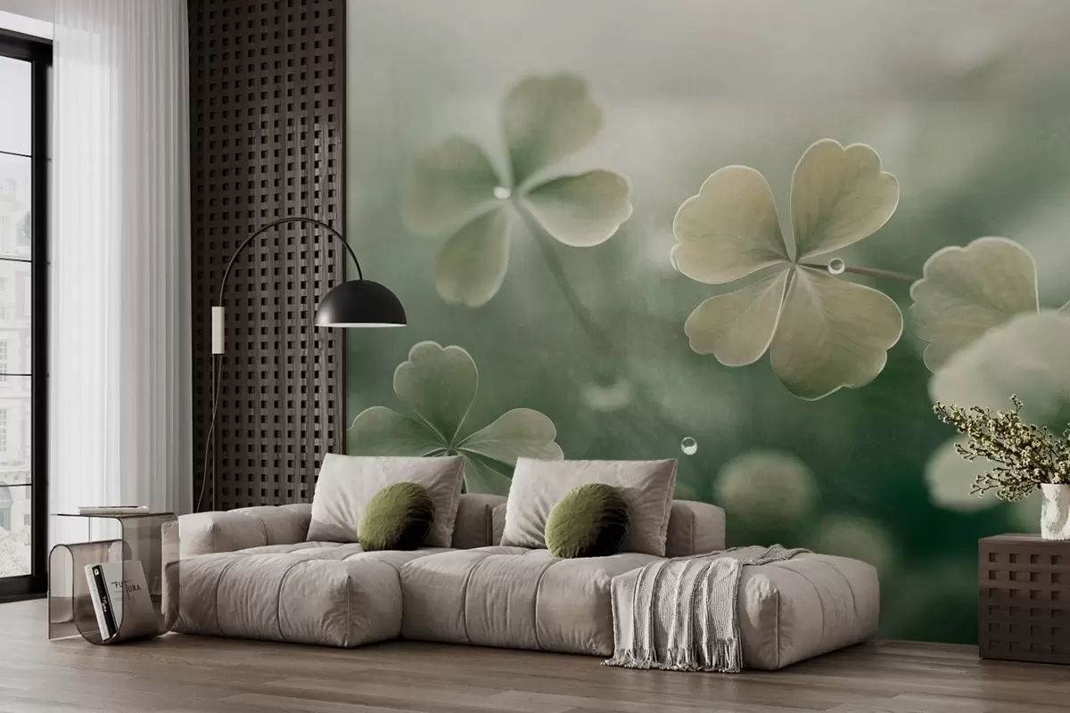 Фототапет Четирилистни детелини с капки вода, светлозелен цвят, мек фокус, размазан фон, текстуриран печат Nr w09376