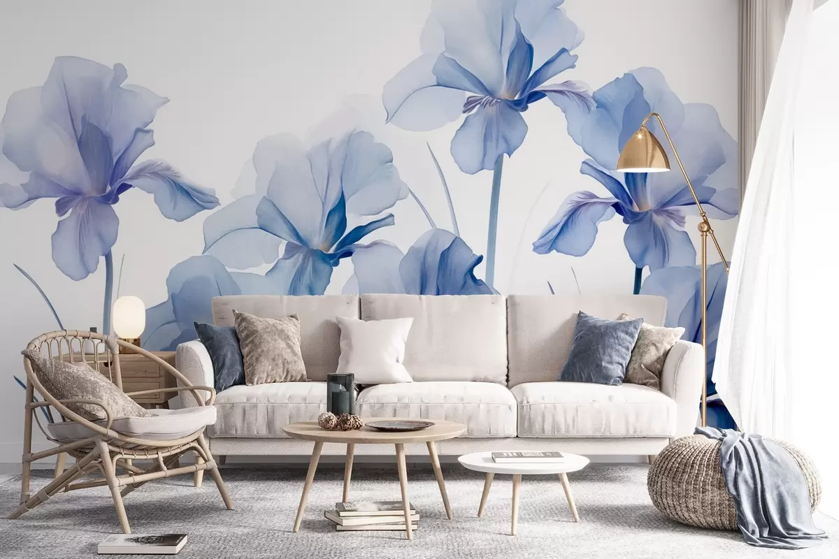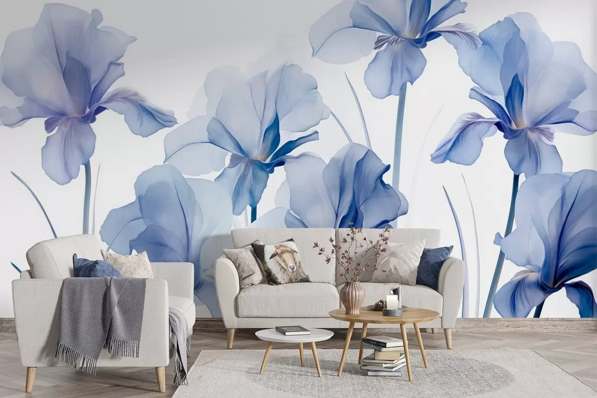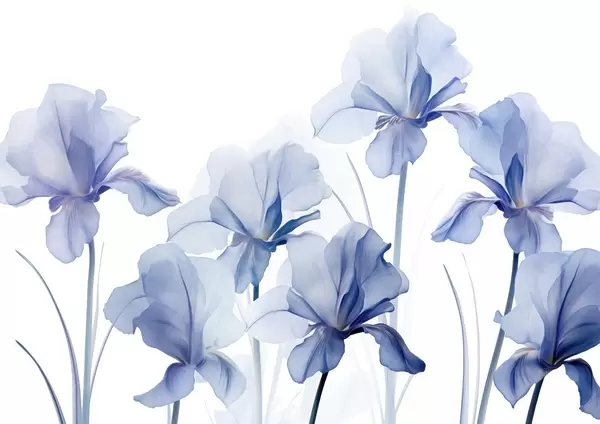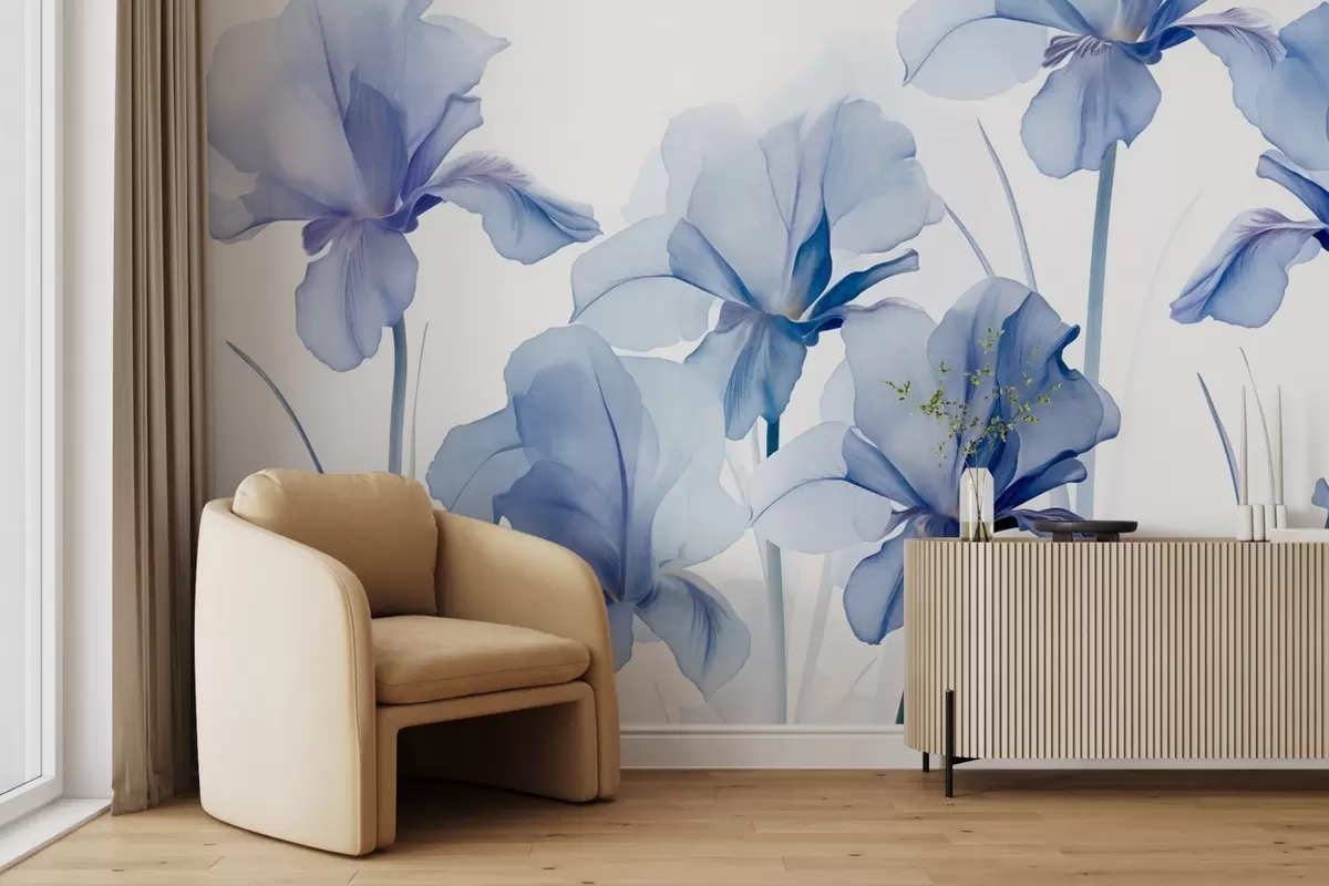 Фототапет Сини цветове ирис с полупрозрачни венчелистчета и дълги стъбла, подредени в редица на син фон, мек и текстуриран Nr w09379