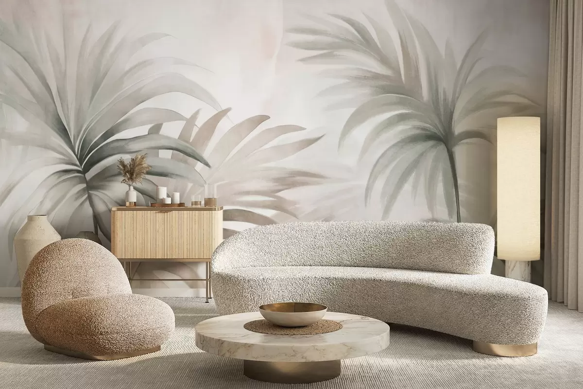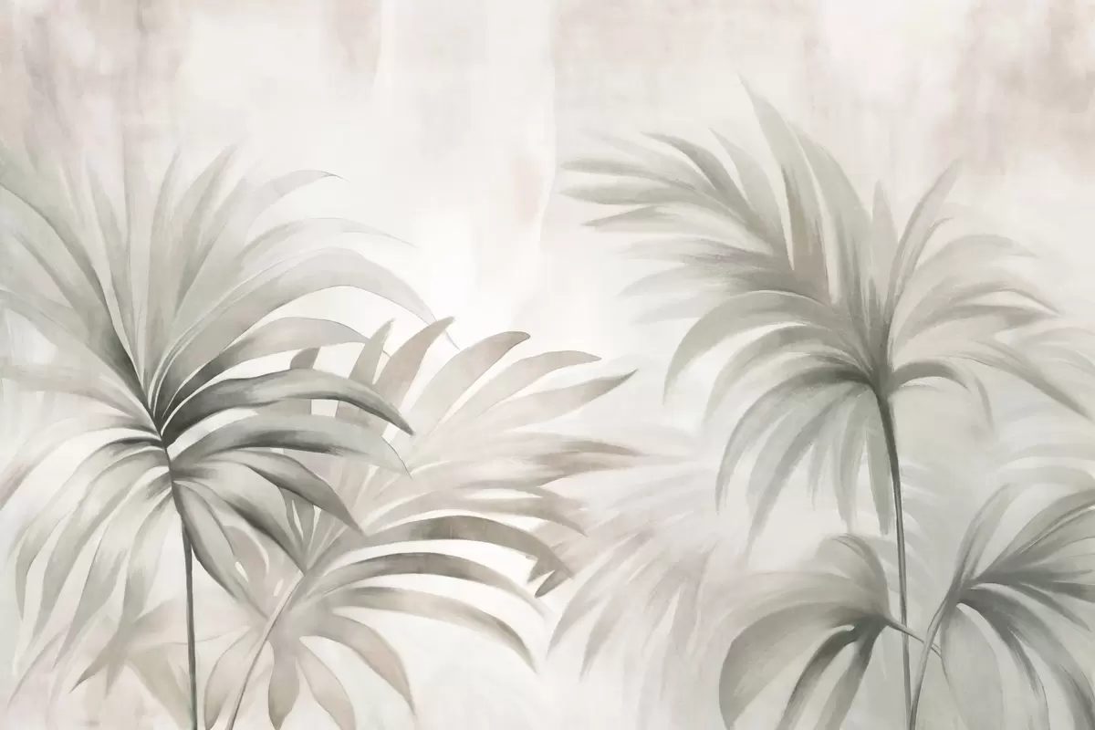 Фототапет Палмово дърво с текстурирани листа в неутрални цветове, бежов абстрактен фон, меки движения на четката, тропически текстурирани листа Nr w09380