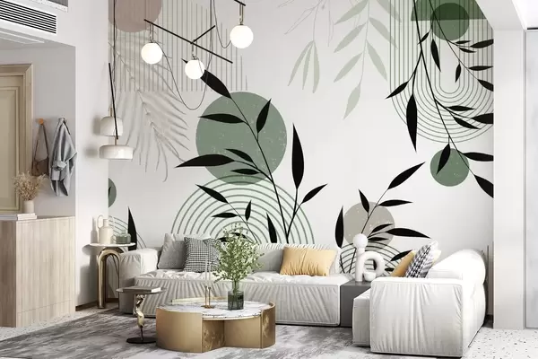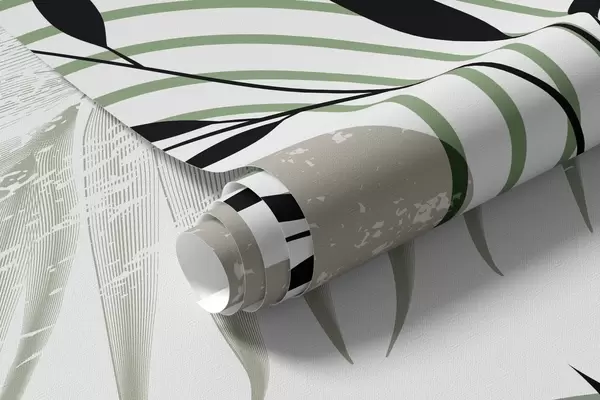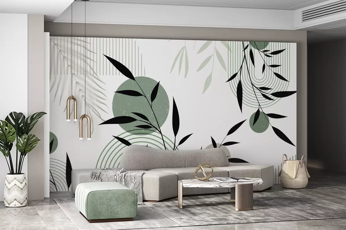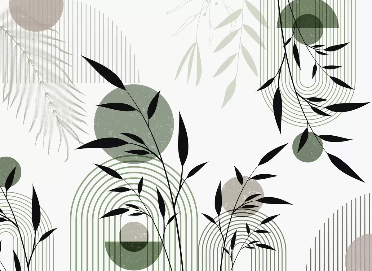 Фототапет Текстуриран абстрактен печат с геометрични фигури, кръгове и арки и черни и зелени растения на бял фон Nr w09384
