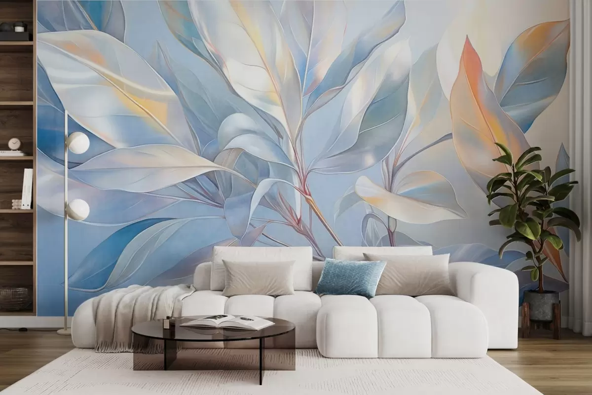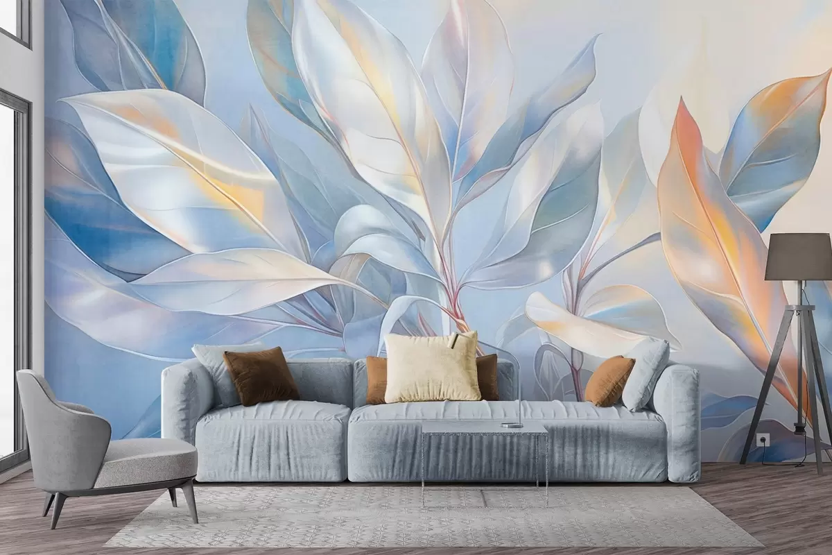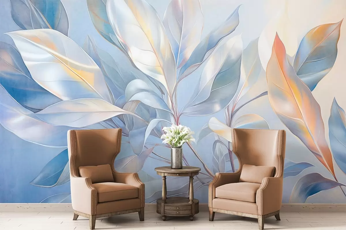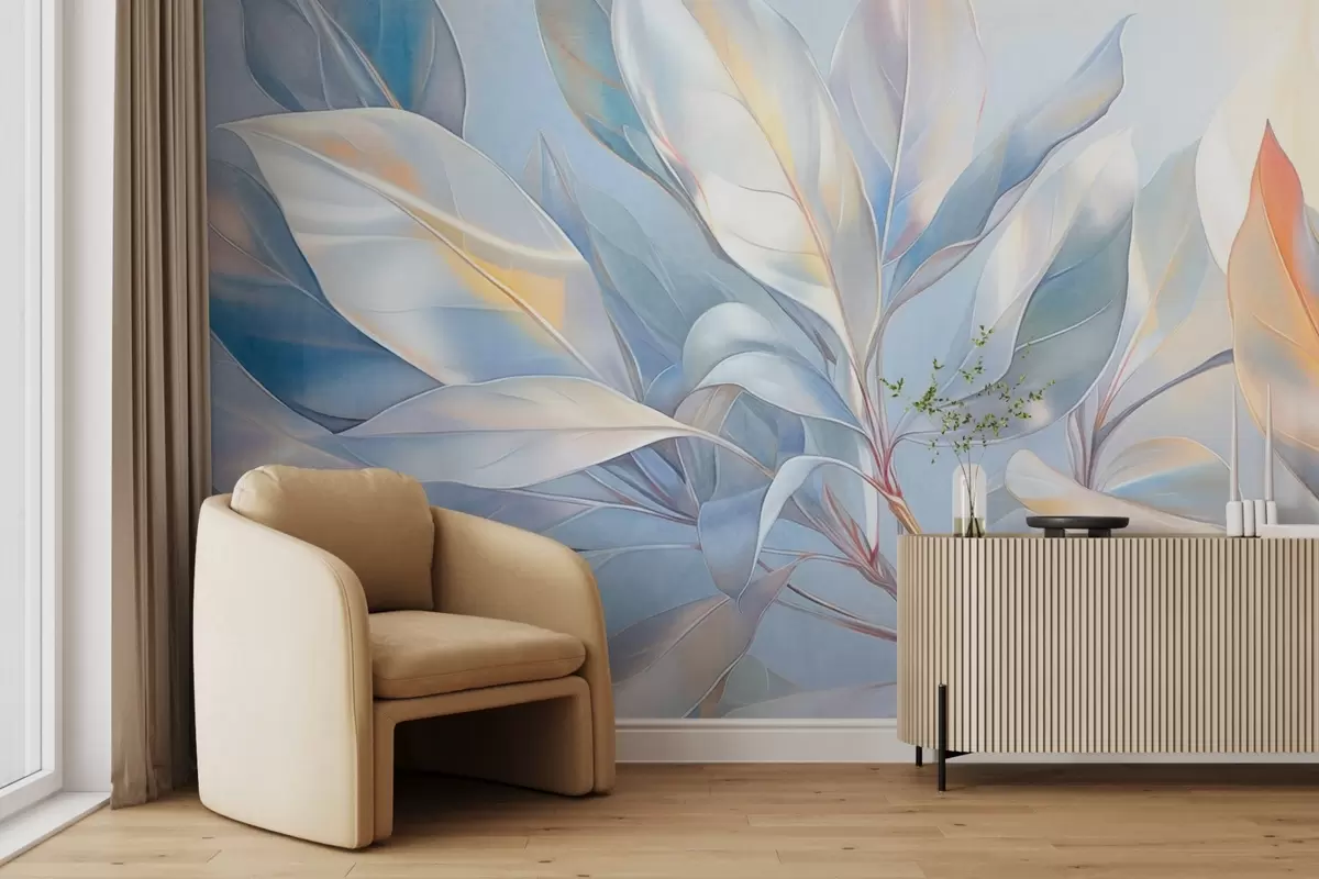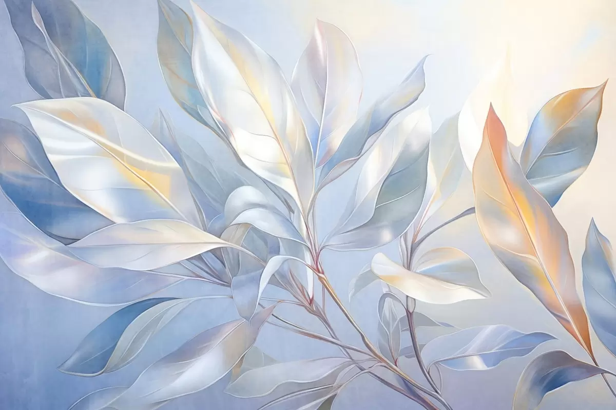 Фототапет Листа на магнолия с бели и сини тонове, меко осветление, елегантна композиция, детайлни жилки на листата, артистични мазки на четката Nr w09385