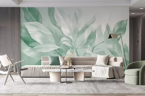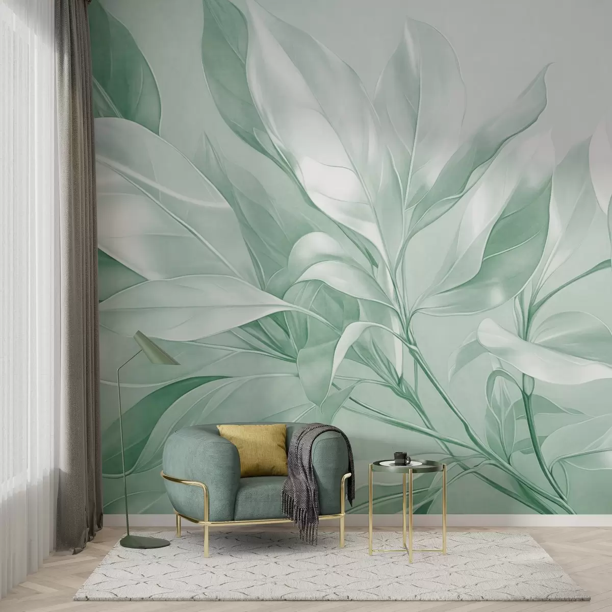 Фототапет Листа на магнолия с бели и зелени тонове, меко осветление, елегантна композиция, детайлни жилки на листата, артистични движения на четката Nr w09385v1