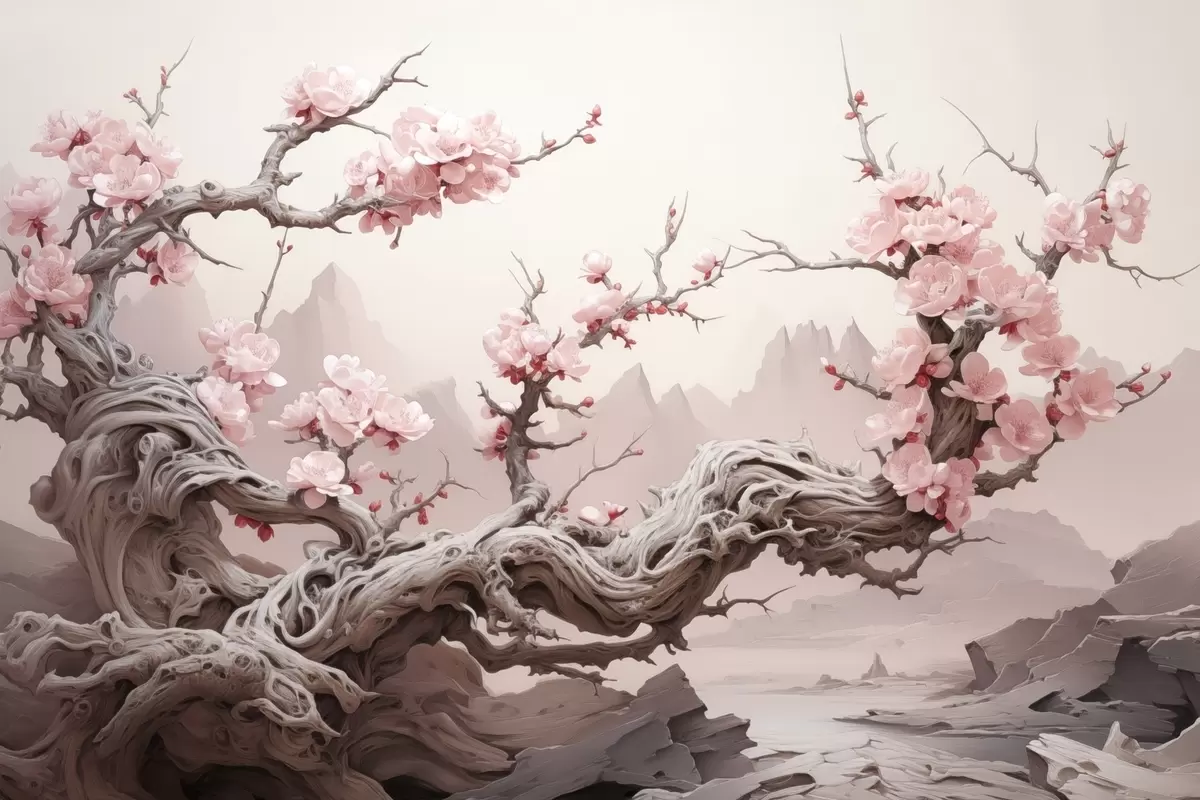Фототапет Усукан ствол на дърво с разцъфнала розова сакура Nr w09388