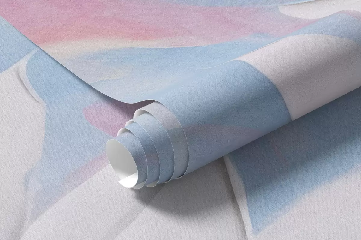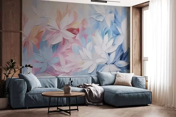 Фототапет Бели текстурирани цветя с розови и сини листа, абстрактен стил на маслена живопис, меки четковъдни щрихи, пастелни цветове Nr w09396