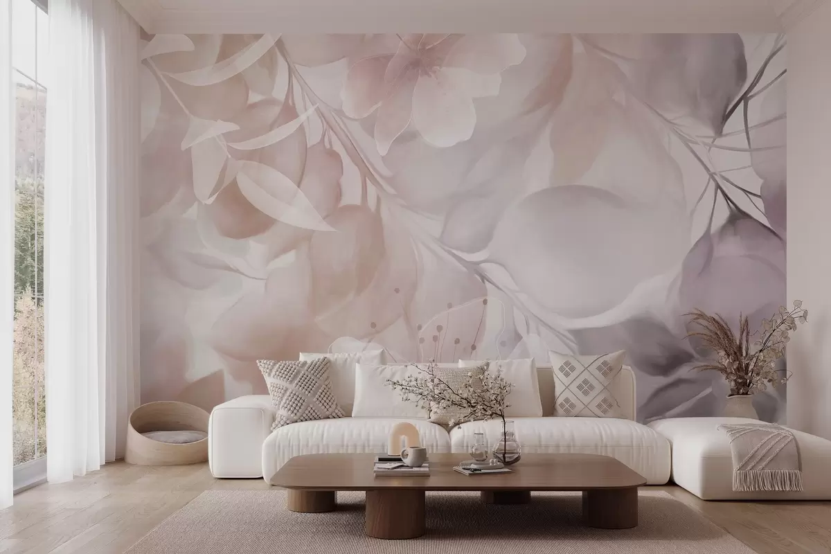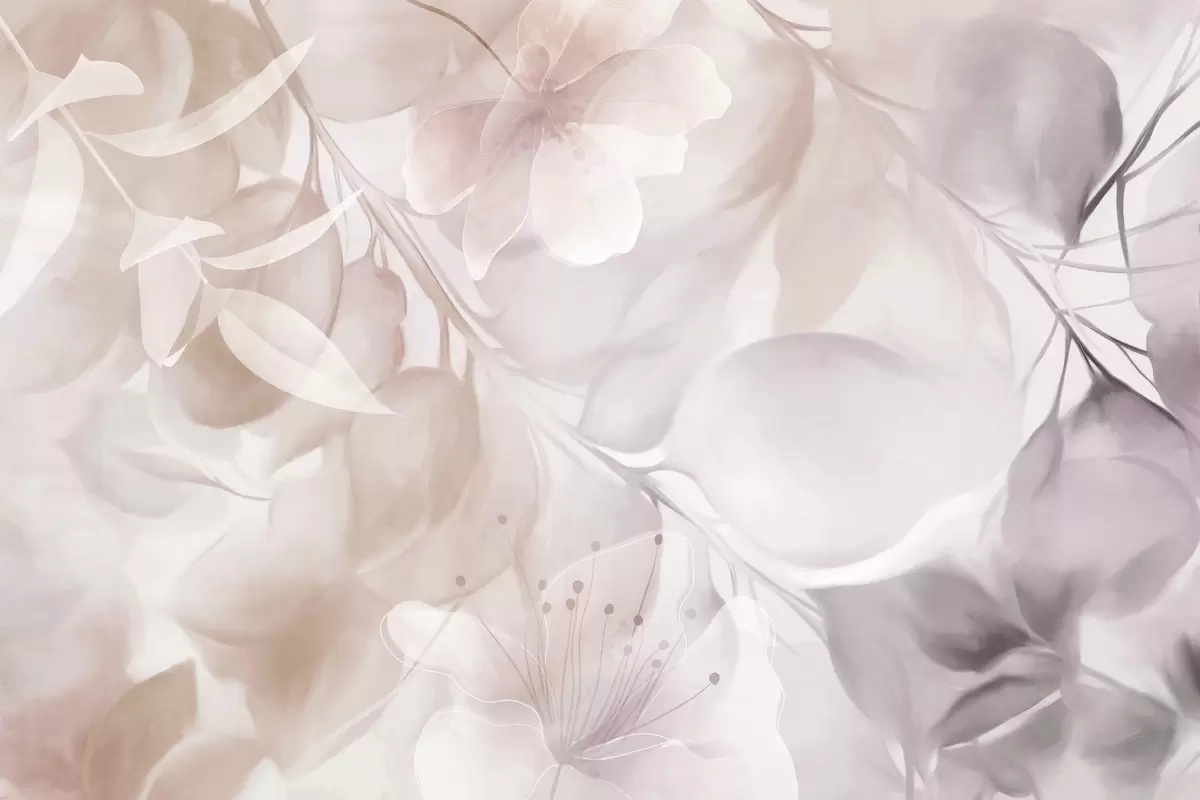 Фототапет Цветя с приглушени бежови и кафяви цветове, листа и клони, меки пастелни цветове, ефект на акварелна текстура Nr w09397