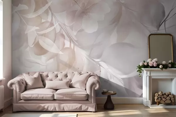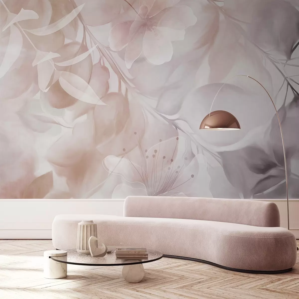 Фототапет Цветя с приглушени бежови и кафяви цветове, листа и клони, меки пастелни цветове, ефект на акварелна текстура Nr w09397