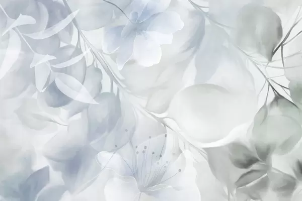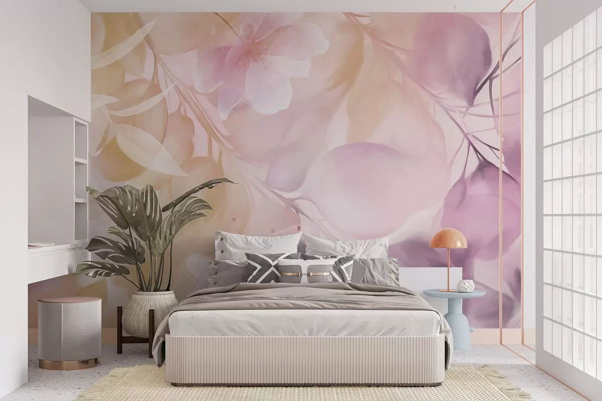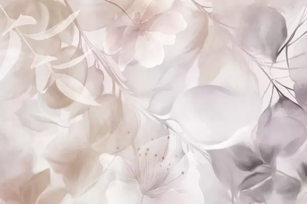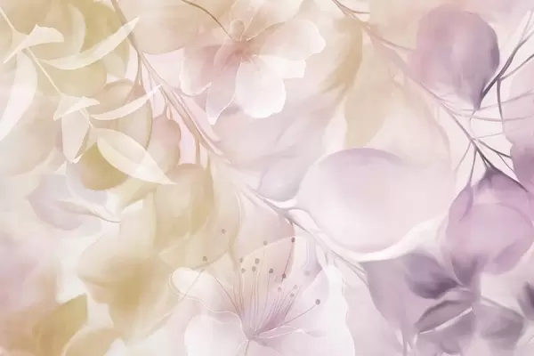 Фототапет Цветя с приглушени жълти и лилави цветове, листа и клони, меки пастелни цветове, ефект на акварелна текстура Nr w09397v2