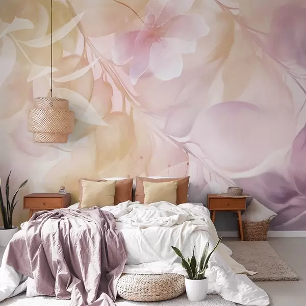 Фототапет Цветя с приглушени жълти и лилави цветове, листа и клони, меки пастелни цветове, ефект на акварелна текстура Nr w09397v2