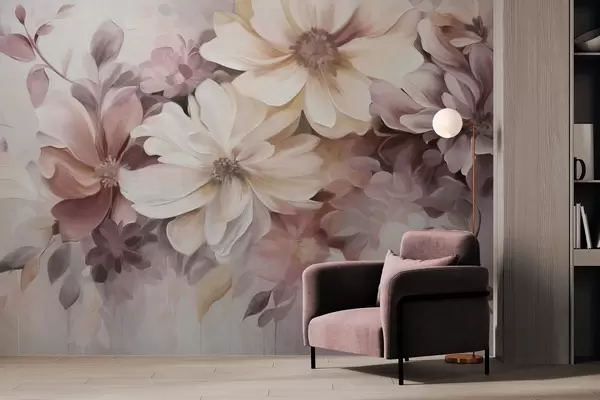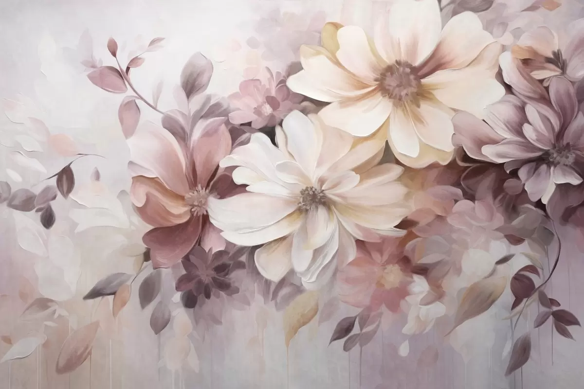 Фототапет Цветя с големи, меки цветове в нюанси на бордо, праскова и бяло, с нежни листа Nr w09398