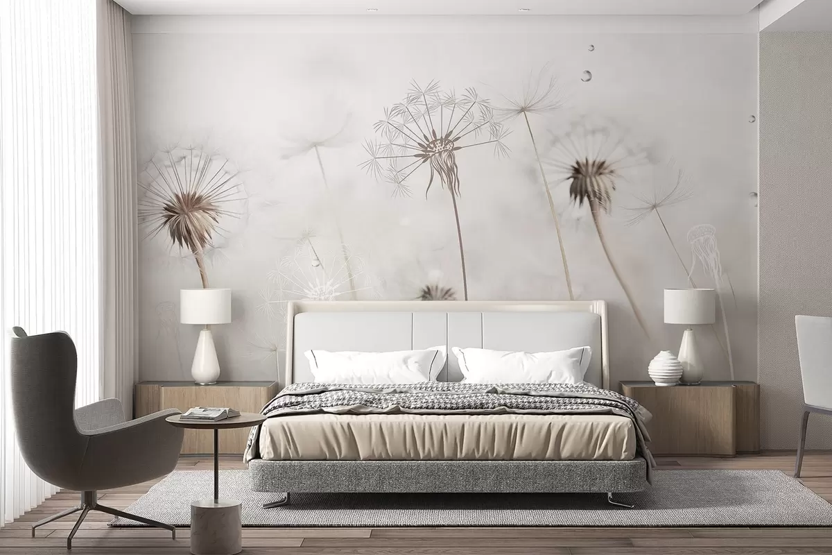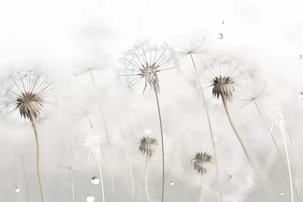 Фототапет Лютици с капки вода, бял фон, близък план, мека светлина, природа, ботанически, ефирен, деликатен, минималистичен Nr w09399