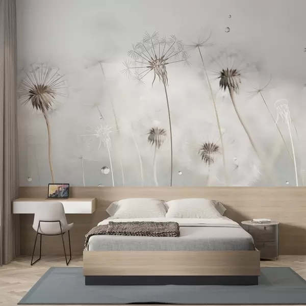 Фототапет Лютици с капки вода, бял фон, близък план, мека светлина, природа, ботанически, ефирен, деликатен, минималистичен Nr w09399