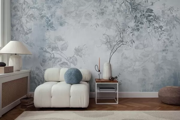 Фототапет Винтидж текстурирано флорално изкуство с илюстрации на нежни градински цветя и листа в стил рисунка, меки сини тонове Nr w09402v1