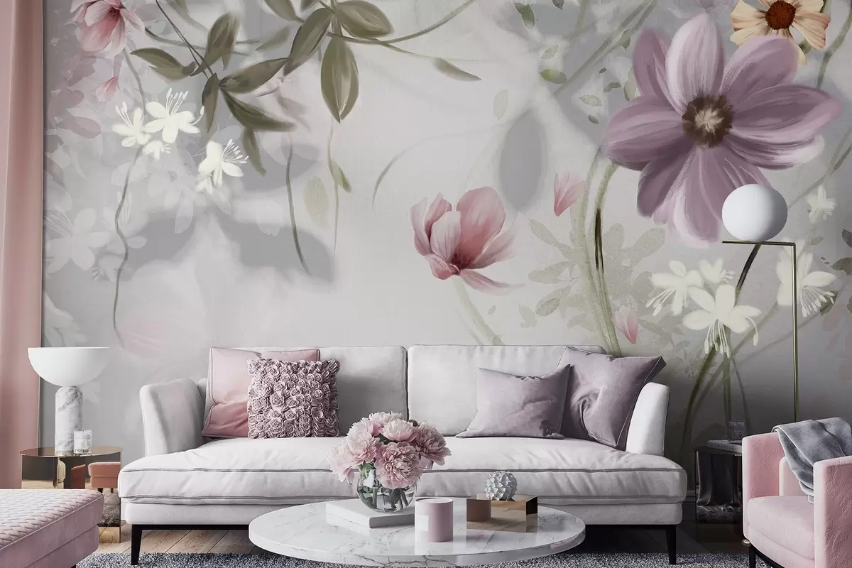 Фототапет Розови и бели цветя със зелени стъбла и листа, меко осветление, приглушени цветове, цветя Nr w09417v1