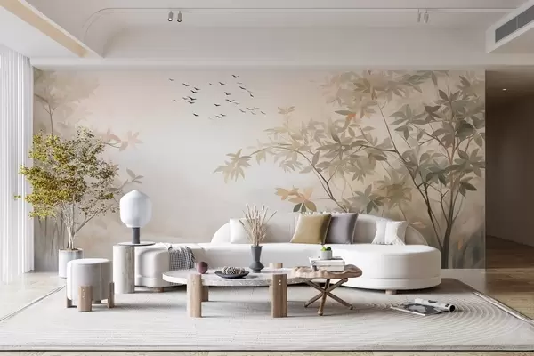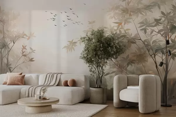 Фототапет Текстуриран пейзаж с дървета и ято птици, летящи в небето, пастелни цветове, природна сцена Nr w09418